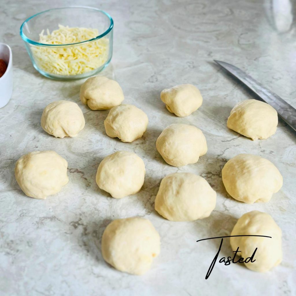 - Divide the pizza dough into 12 equal pieces. Do this by shaping the dough into a 6 inch square. Cut the square into 4 strips, then cut each strip into 3 pieces.